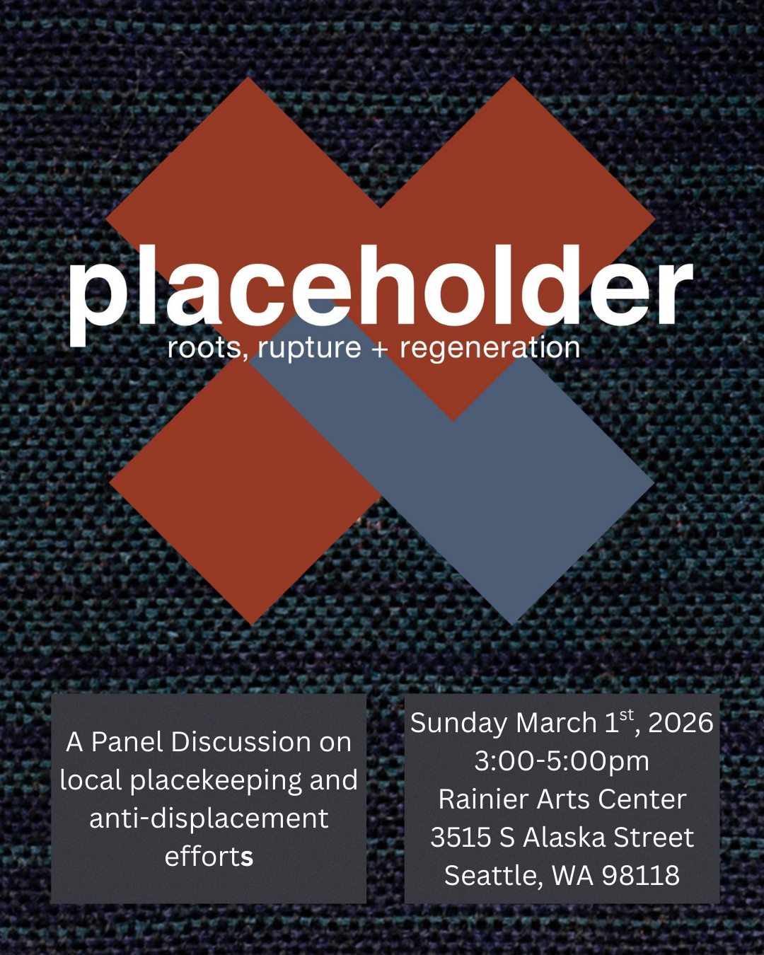 Join us for a community conversation held in conjunction with the current exhibit at Columbia City Gallery, PLACEHOLDER: Roots, Rupture + Regeneration. This gathering brings together voices from across communities and organizations engaged in local place keeping and anti-displacement efforts.